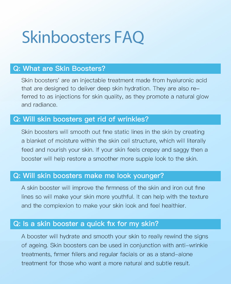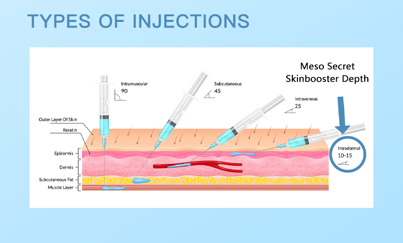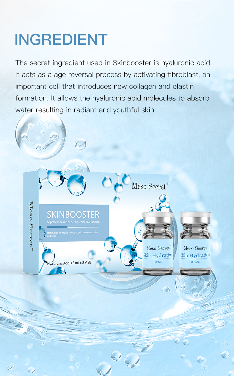 The Meso Secret Skinbooster will be injected superficially into the top layer ofthe skin, under the epidermis. It will be injected using a fine needle for maximumcomfort and minimal skin trauma. The product will be placed in tiny 'blebs' underthe skin in close proximity. This produces the optimal reaction for the skin cellsand covers maximal surface area.